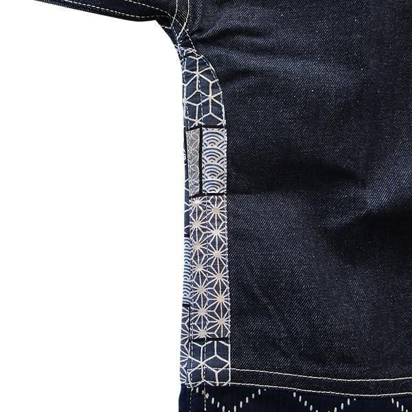 はっぴ(法被)の隅々まで施された縫製は、 糸の色、ミシンをかける位置、針の選定から ピッチの間隔まで厳密に定めています。 わずかなずれが、はっぴの立体感をそこなうため デニムの特殊性を知る、何十年と経験のある職人のみが、 ミシンをかけます。手数を惜しまず目の揃った 緻密なダブルステッチがはっぴの立体感を生み出します。